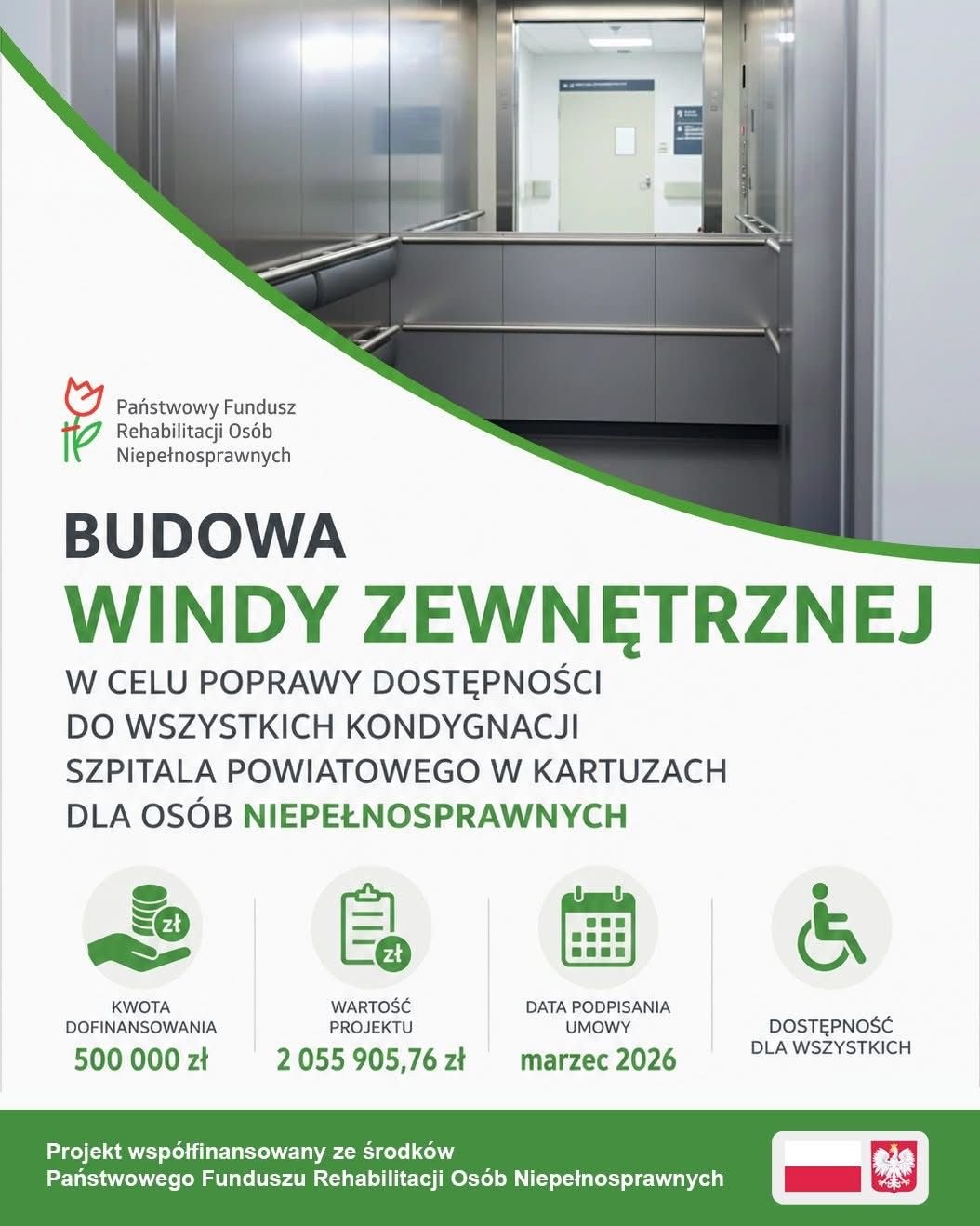 Powiatowe Centrum Zdrowia w Kartuzach pozyskało 500 tys. zł dofinansowania z PFRON na budowę zewnętrznej windy przy Szpitalu Powiatowym. To inwestycja, która znacząco poprawi dostępność placówki dla pacjentów.