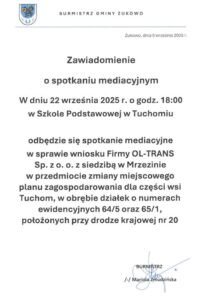 W poniedziałek, 22 września 2025 r., o godz. 18.00 w Szkole Podstawowej w Tuchomiu odbędzie się spotkanie mediacyjne dotyczące wniosku firmy OL-TRANS Sp. z o.o. z siedzibą w Mrzezinie. Spotkanie dotyczy zmiany miejscowego planu zagospodarowania przestrzennego dla części wsi Tuchom.