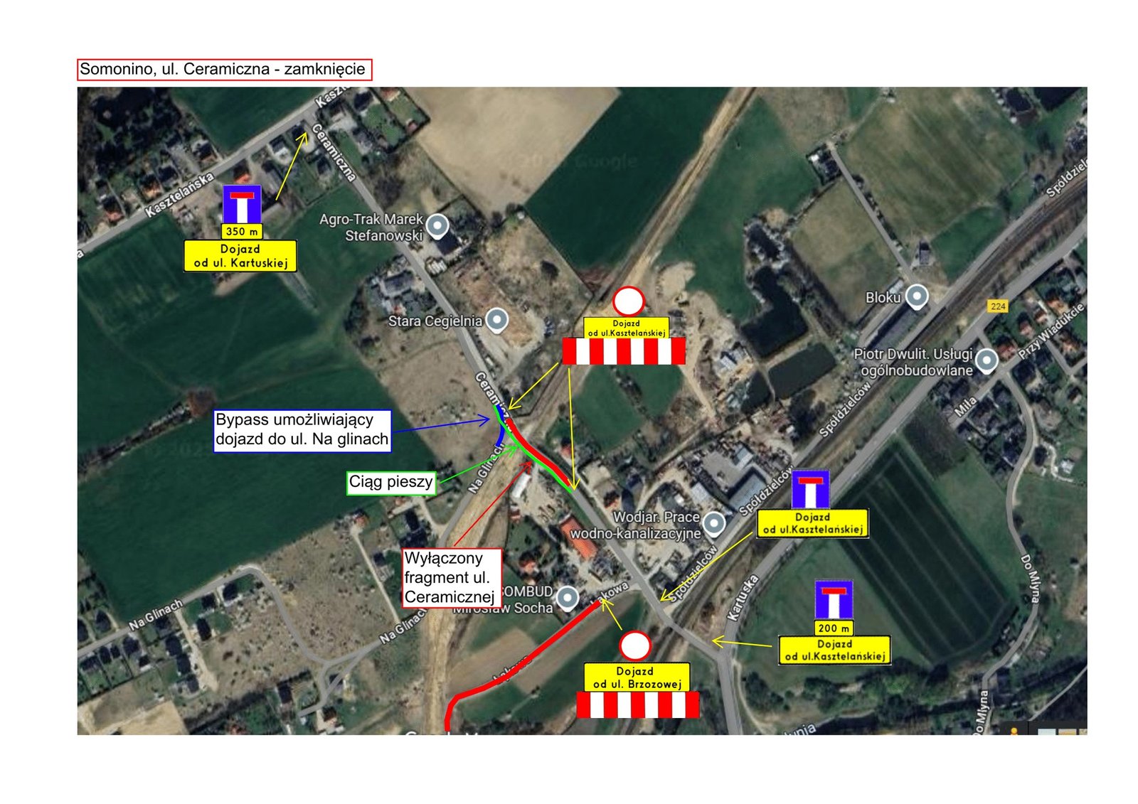 Gmina Somonino informuje, że w związku z realizacją prac budowlanych przez firmę Budimex S.A. na kontrakcie „Odcinek A – Roboty budowlane na liniach kolejowych nr 201 (Kościerzyna–Somonino) oraz nr 214 (Somonino–Kartuzy)”, w ramach projektu „Prace na odcinku Kościerzyna – Gdynia”, od dnia 8 października 2025 r. zostanie wprowadzona tymczasowa zmiana organizacji ruchu na ul. Ceramicznej w Somoninie.