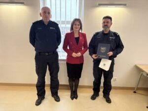 W Komisariacie Policji w Żukowie odbyło się uroczyste spotkanie związane z wręczeniem aktów mianowania na kolejne stopnie służbowe żukowskim funkcjonariuszom oraz przekazaniem nowego radiowozu. Podczas wydarzenia Burmistrz Gminy Żukowo Mariola Zmudzińska przekazała komendantowi podinsp. Zenonowi Halmanowi kluczyki do nowego pojazdu. Gmina Żukowo wsparła zakup radiowozu kwotą 72 tys. zł.