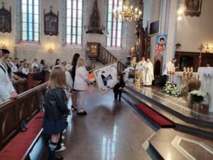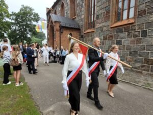 Obchody rozpoczęła msza święta w miejscowym kościele, podczas której wprowadzono sztandar szkoły. Kulminacyjnym momentem liturgii było jego poświęcenie. Następnie dyrektor, nauczyciel, rodzic i uczeń – jako reprezentanci szkolnej społeczności – oddali hołd sztandarowi, podkreślając wspólnotowy charakter wydarzenia. Po zakończonej mszy uczestnicy w uroczystym pochodzie przeszli pod pomnik ofiar I wojny światowej.