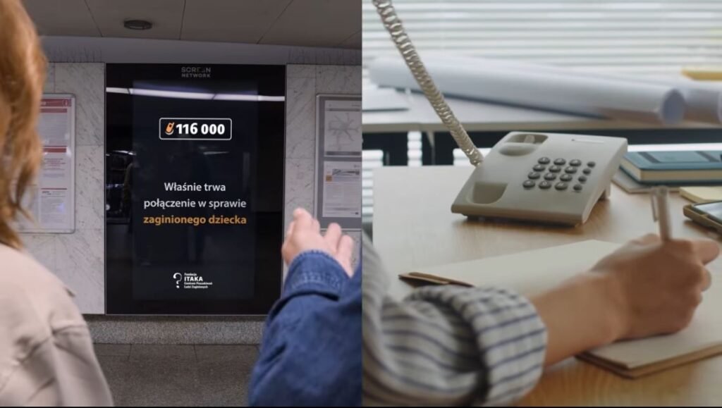 W ramach nowej kampanii Fundacji ITAKA i Screen Network, za każdym razem, gdy ktoś dzwoni na numer 116 000, na ponad 20 000 ekranach w całej Polsce w czasie rzeczywistym wyświetla się komunikat: „Właśnie trwa połączenie w sprawie zaginionego dziecka”. Layout ekranów zmienia się w dzwoniący telefon, a zamiast numerów pojawiają się podpisy odzwierciedlające emocje bliskich, takie jak „Spanikowana mama”, „Przerażony dziadek” czy „Rozżalony tata”. To sposób na zwrócenie uwagi, że problem zaginięć dzieci dzieje się tu i teraz, dotykając realnych osób, które w danym momencie proszą o pomoc.