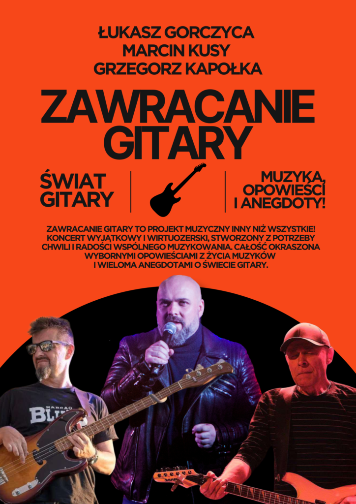 Już sam tytuł zapowiada coś wyjątkowego. „Zawracanie gitary” to projekt inny niż wszystkie – koncert niezwykły, spontaniczny, pełen pasji, muzycznej klasy i… dobrej zabawy. Trio w składzie: Grzegorz Kapołka, Łukasz Gorczyca i Marcin Kusy przygotowało dla publiczności widowisko łączące mistrzowskie wykonania z opowieściami zza kulis muzycznego świata.