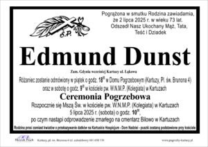 W wieku 73 lat, 2 lipca zmarł Edmund Dunst, wieloletni radny i przewodniczący Rady Miejskiej w Kartuzach. W kartuskiej radzie działał w latach 1990-1994 oraz 2002-2014, angażując się w sprawy lokalnej społeczności. Był także znanym lokalnym przedsiębiorcą.