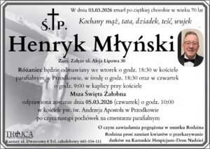 3 marca 2026 roku, po ciężkiej chorobie, w wieku 70 lat zmarł Henryk Młyński – mieszkaniec Załęża, mąż, ojciec, dziadek, teść i wujek. Jego odejście to bolesna strata nie tylko dla rodziny, ale również dla środowiska zawodowego, z którym był związany przez wiele lat.