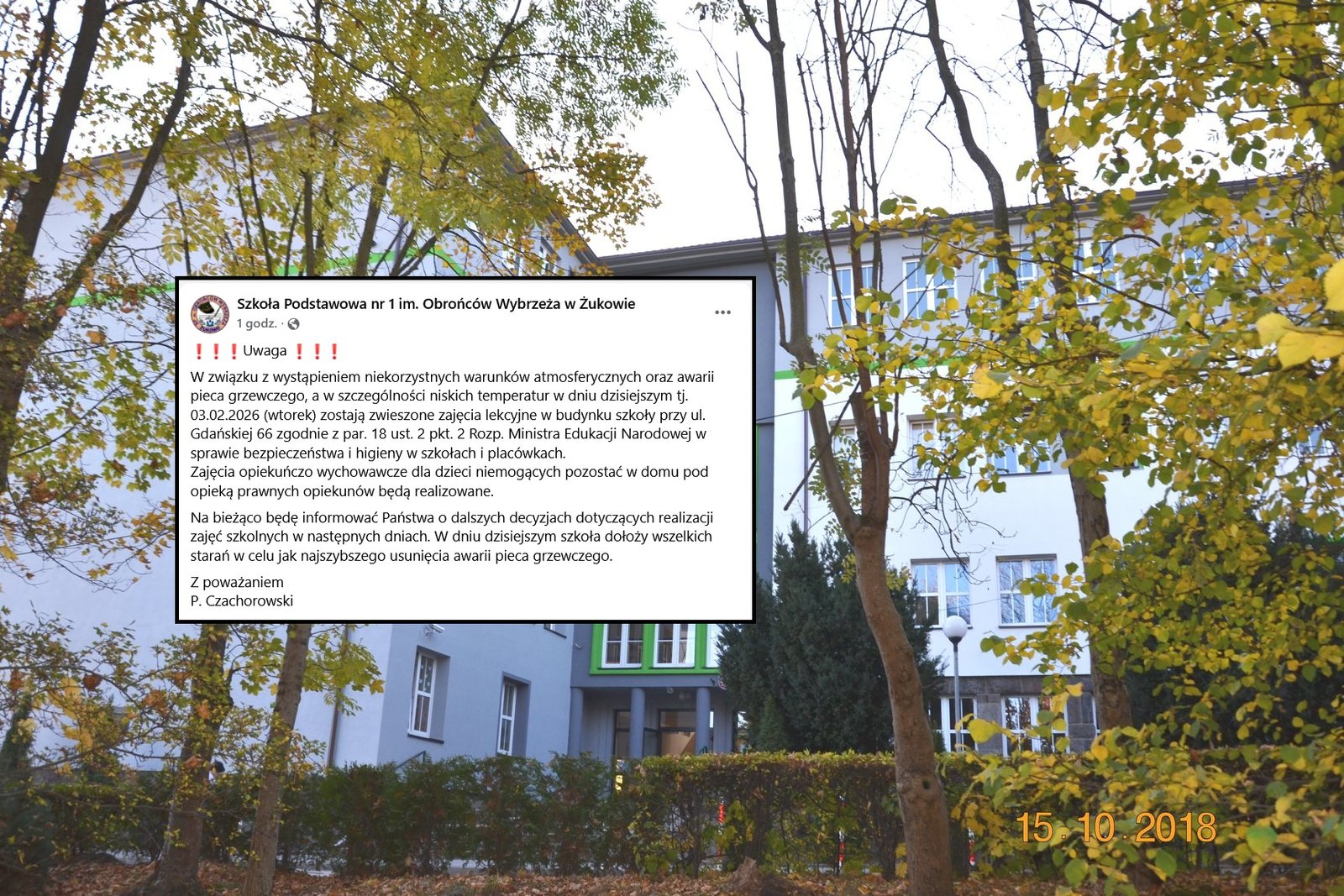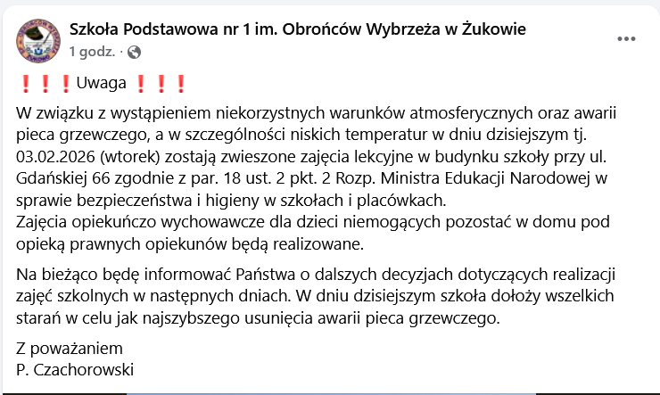 W związku z niekorzystnymi warunkami atmosferycznymi oraz awarią pieca grzewczego podjęto decyzję o czasowym zawieszeniu zajęć dydaktycznych w budynku Szkoły Podstawowej nr 1 im. Obrońców Wybrzeża w Żukowie przy ul. Gdańskiej 66.